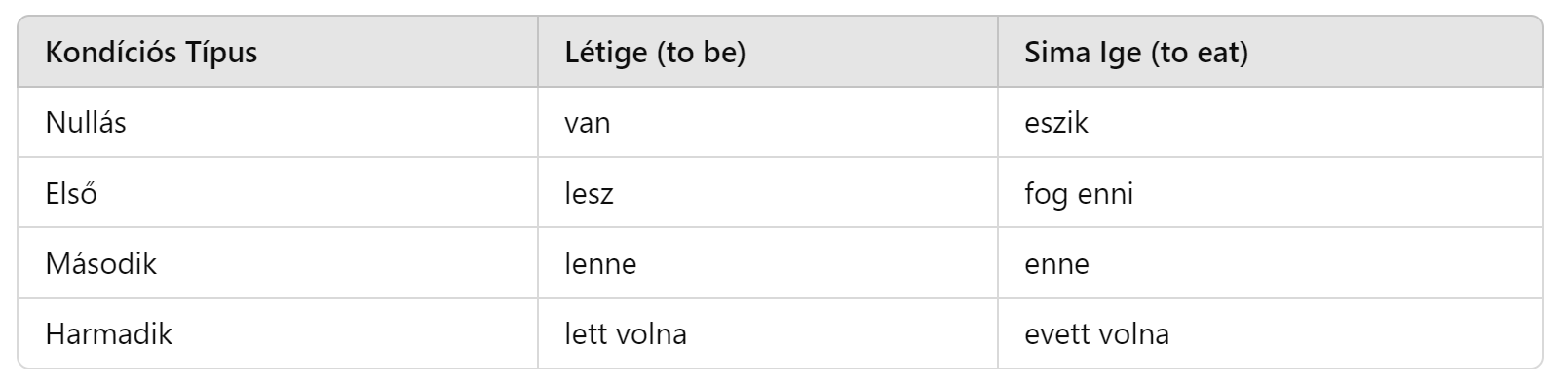 Ez a táblázat segíthet gyorsan azonosítani a megfelelő kondíciós szerkezetet az angol nyelvben különböző helyzetekhez. Vegyük a létigét és egy egyszerű, hétköznapi igét. Ha magyarul elmondod a feltételes mondatodat, akkor ez alapján a táblázat alapján be fogod tudni azonosítani.