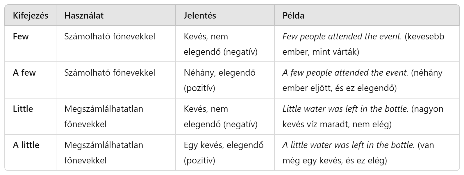 Little: negatív jelentést hordoz, és arra utal, hogy nagyon kevés van belőle, és ez nem elég.