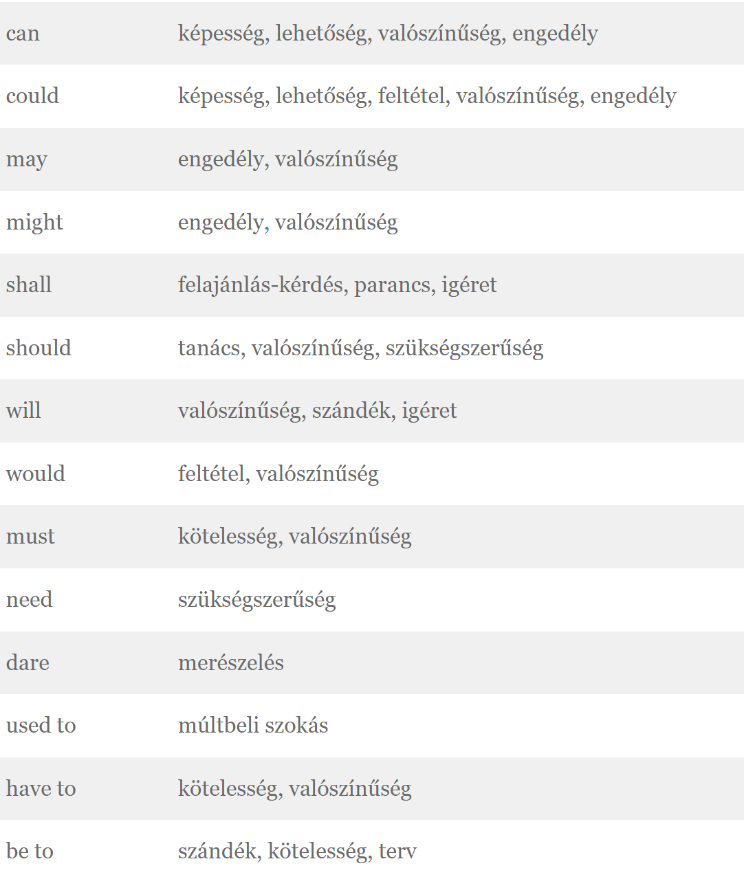 Ezen kívül vannak még "fél"modálisok is, amikről szintén szó lesz.