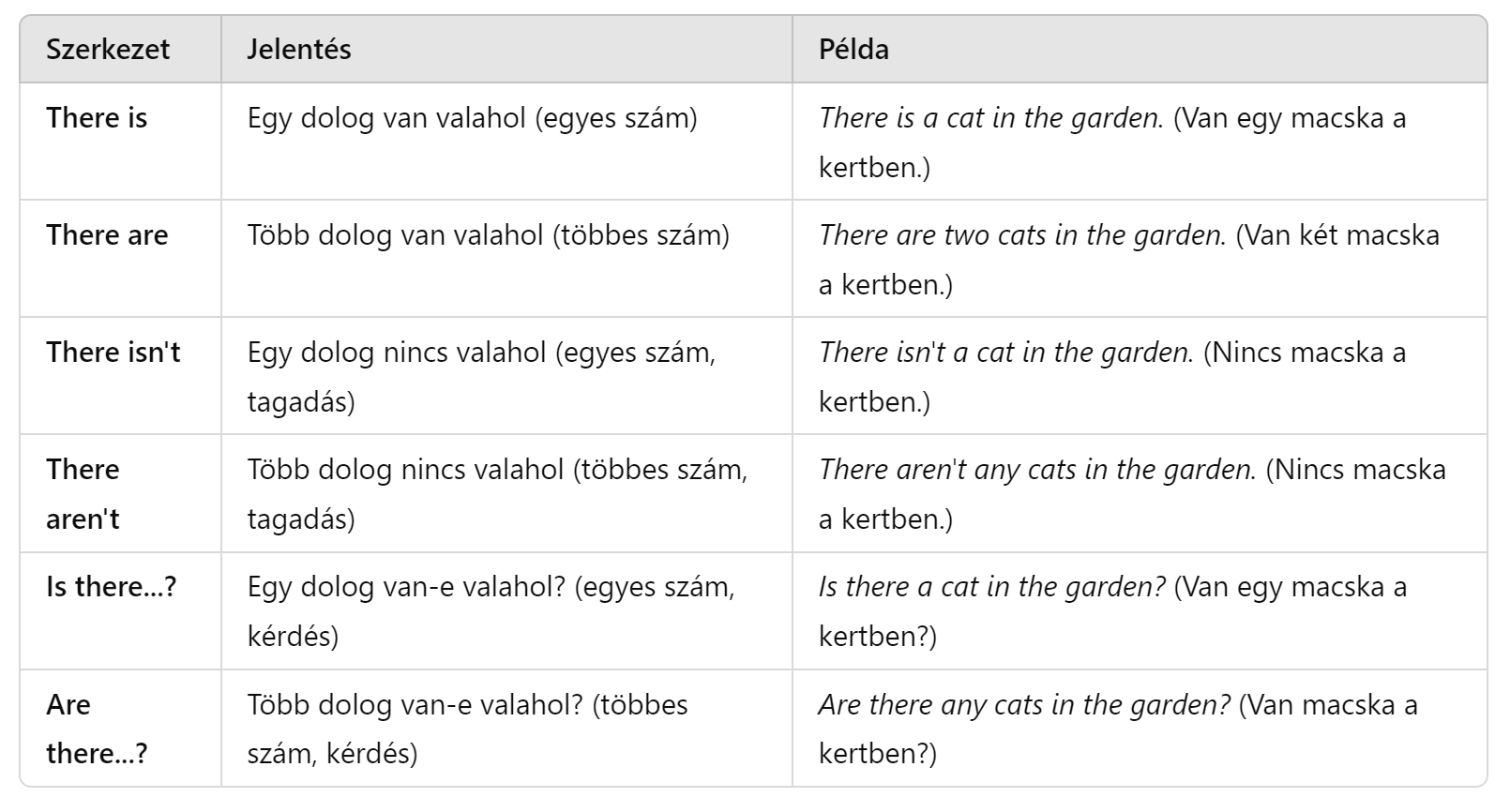 "There is": Új információt vezet be, és arra használjuk, hogy kijelentsük, valami van valahol, vagy létezik.