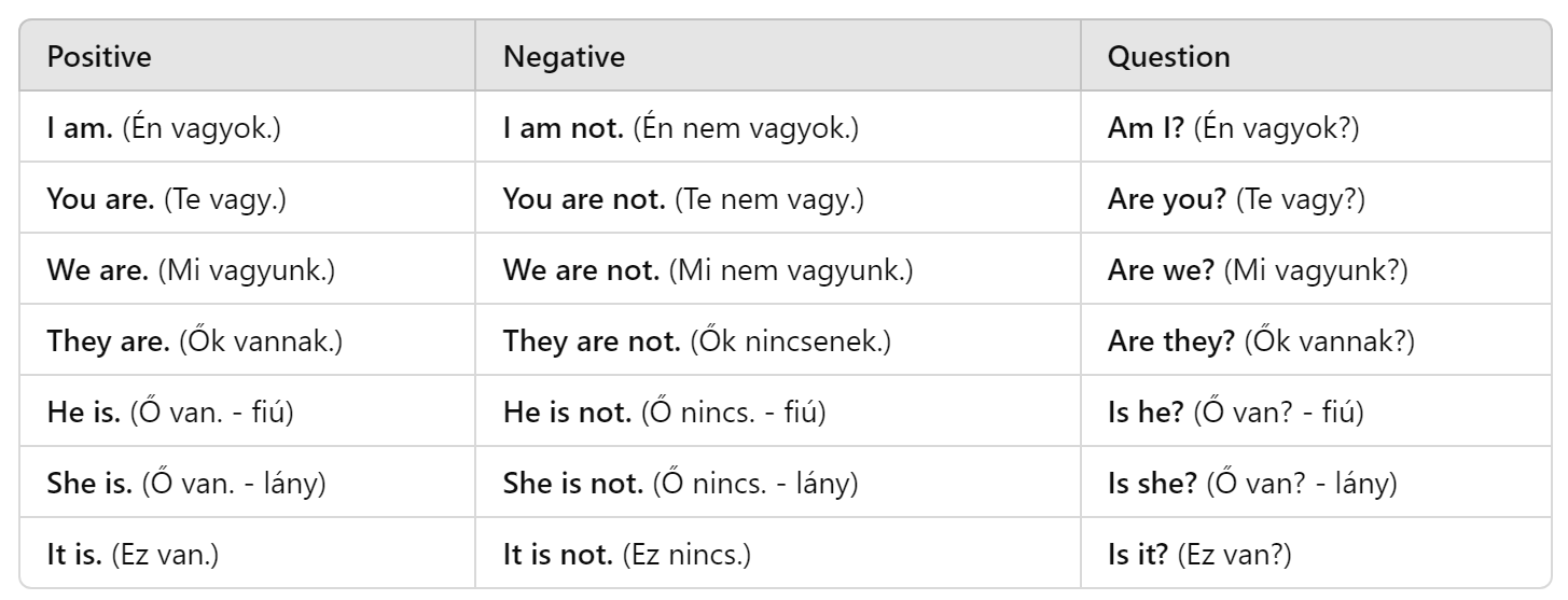 A magyar nyelvben a "van" ige (a "to be" megfelelője) gyakran elhagyható, különösen jelzős szerkezetekben és állítmányként funkcionáló melléknévi szerkezetekben a jelen időben. Nézzük mit jelent ez magyarul: