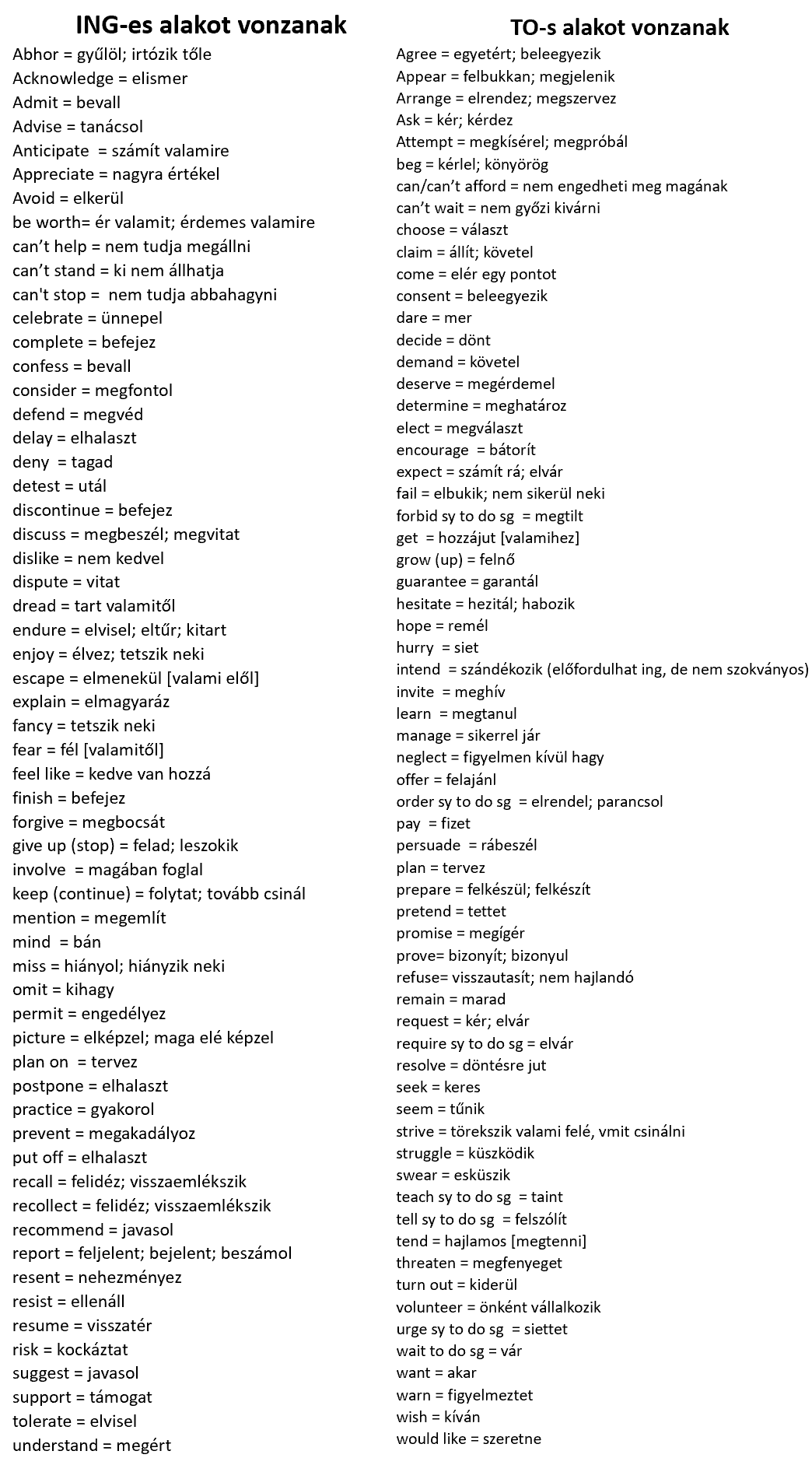 5. Bizonyos igék után kötelező to vonzat (lista a lap alján)