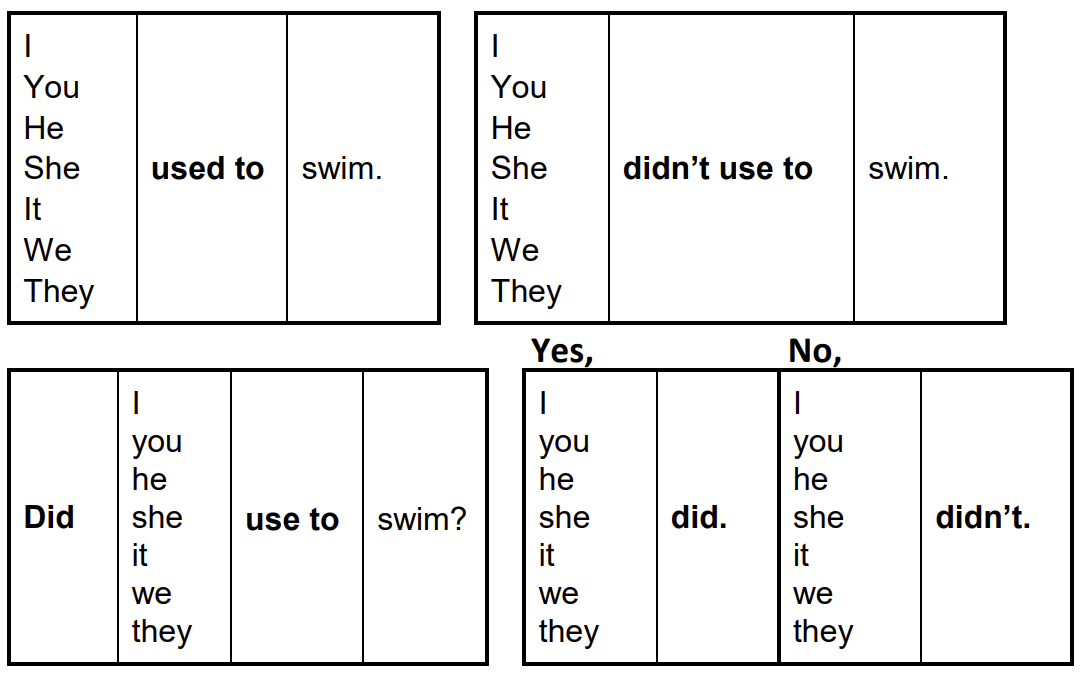 A „used to” szerkezetet olyan múltbeli cselekvések és állapotok leírására használjuk, amelyek régen igazak voltak, ma már azonban nem jellemzőek. Magyarul, ezt a ma már nem használatos kifejezést takarná: "szoktam volt" valamit csinálni. Például: