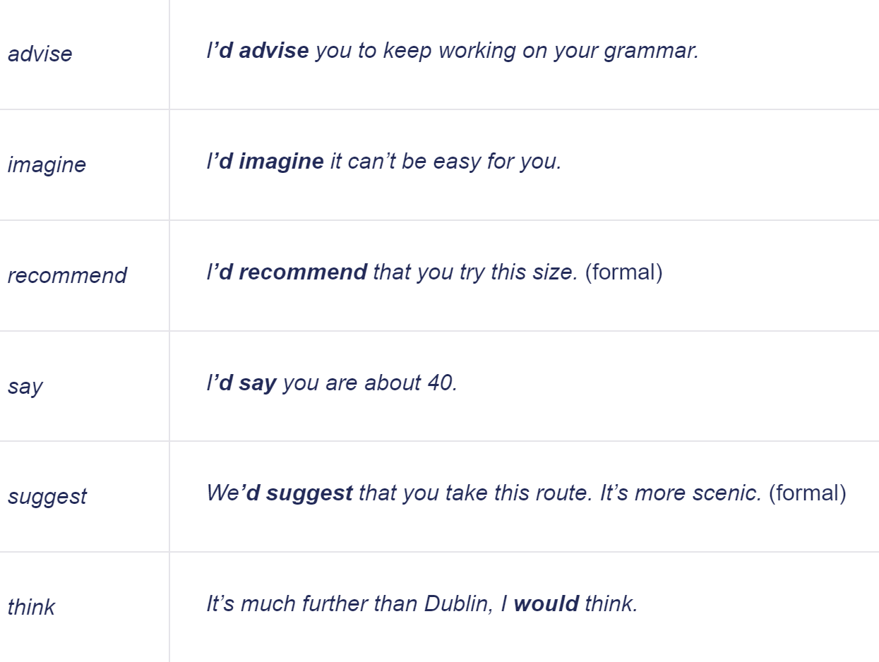 Gyakran használjuk a would-ot igékkel mint: advise, imagine, recommend, say, suggest, azért hogy kevésbé közvetlen legyen.